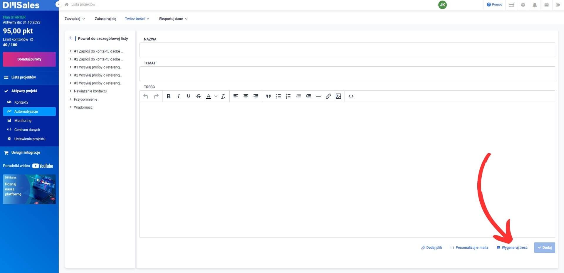 Z funkcji generowania treści narazie można skorzystać na dwa sposoby, jeden – poprzez „Twórz treści”, drugi – poprzez „Automatyzacje” (Pracujemy również nad sposobem generowania spersonalizowanych wiadomości przez „Konwersacje”, tak aby sztuczna inteligencja mogła odpowiadać za Ciebie)